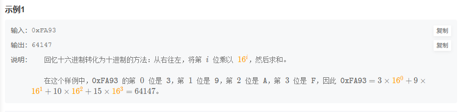 在本题中,十六进制数的格式为:0x 开头,后跟若干个十六进制数字(保证为 0-9 和 A-F 中的一个)。其中,A-F 依次代表十进制中的 10∼15。