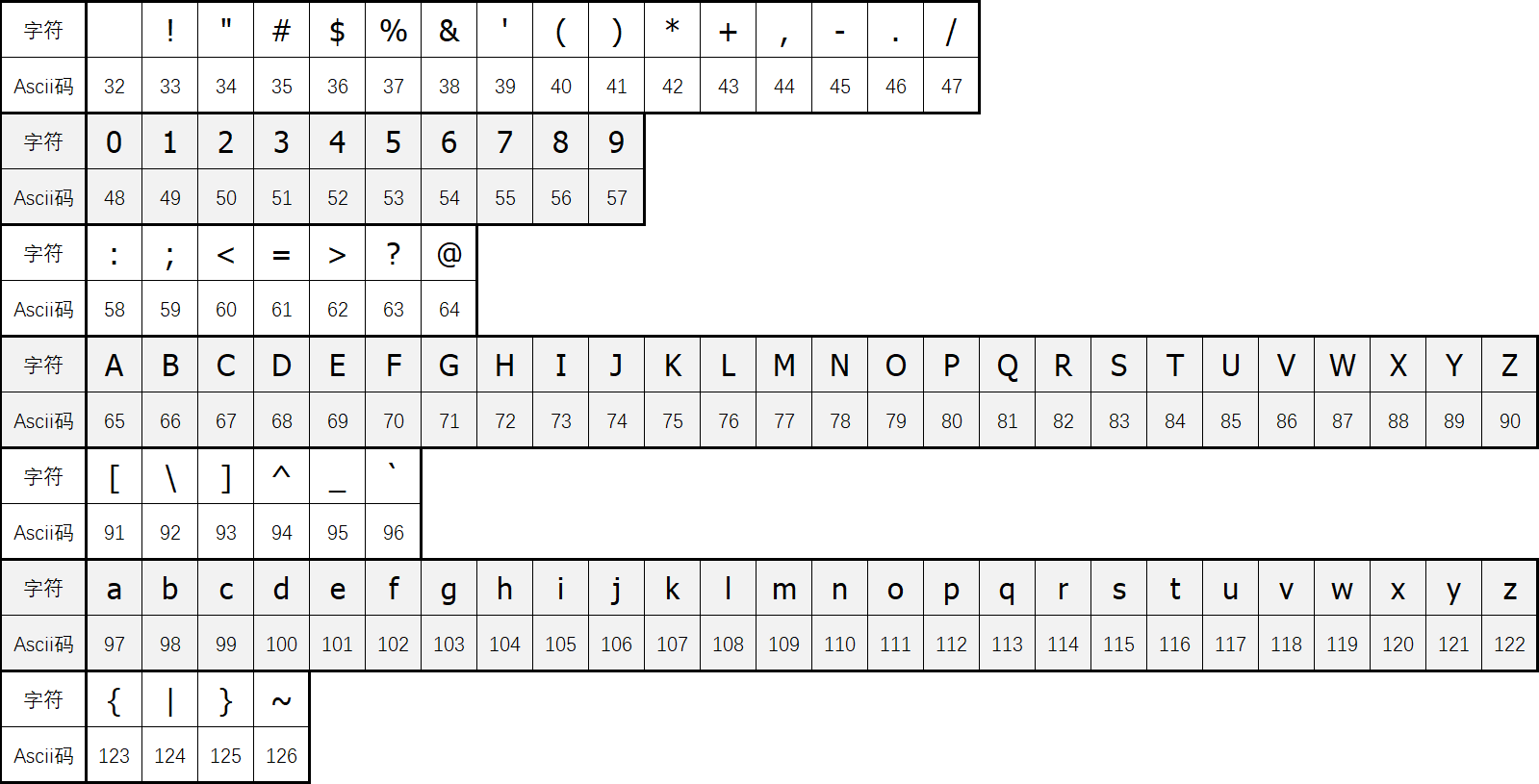 字符串由 ASCII 码在 32 到 126 范围内的字符组成。您可以参阅下表获得其详细信息。